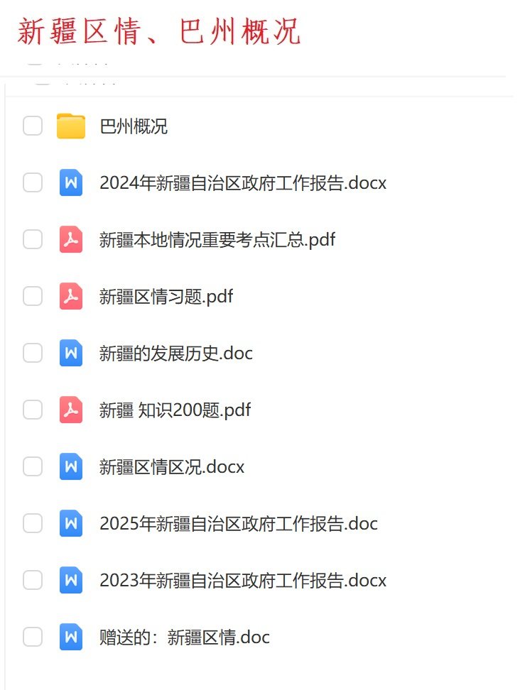 3.笔试科目:《综合知识》满分100分。《综合知识》测试主要内容为公共基础知识、新疆历史和民族宗教理论、新疆维吾尔自治区区情、巴音郭楞蒙古自治州州情、时事政治等相关内容。