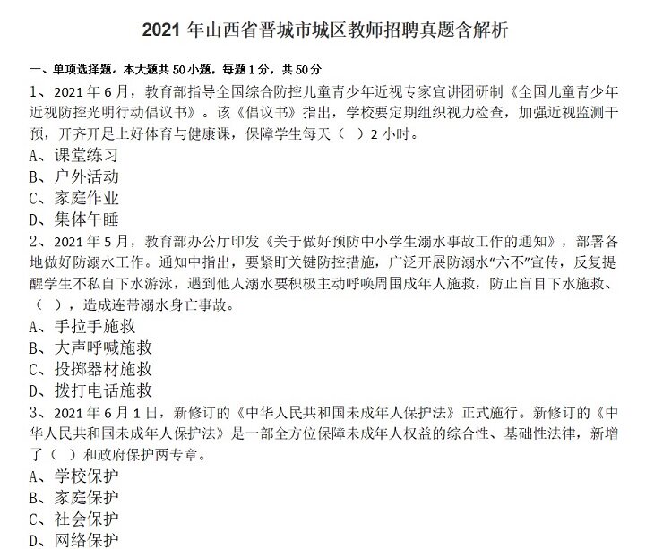 2022山西晋城市城区教师招聘教育学心理学教育法律法规题库真题