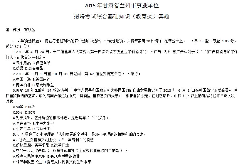 笔试科目为《综合基础知识》,分专业技术岗位(教育类、卫生类、财会类、新闻类、其他类)类、管理岗位类和工勤技能岗位类,采用闭卷方式,一律用汉语作答。